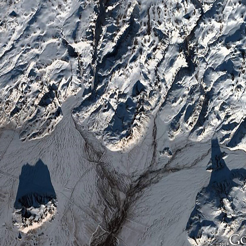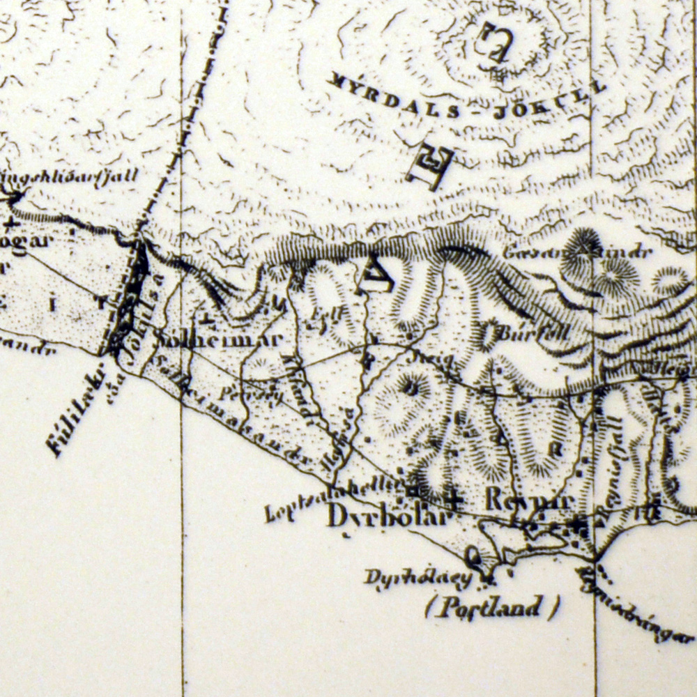 Mynd 7: Loftmynd af Google Earth, tekin eftir árið 2000. Á myndum 5, 6 og 7 er búið að leggja veginn inn í Fellsmörk og veita Klifandi undir brúna á svipuðum slóðum og núna er. Varnargarðar voru settir upp til að beina ánum á réttum stað undir brúna. Sérstakir varnargarðar til að vernda landið vestan Fellsfjalls norðaustan við ána voru ekki settir upp. Erfitt er að sjá af myndunum hvað áin hefur tekið mikið af landinu en vitað er að eitthvað hefur farið. Mat Kristins er hins vegar að í megindráttum sé "strandlengjan" norðaustan árinnar að mestu leyti eins og hún var áður en framkvæmdir við varnargarða hófust fyrir um 60 árum. Mynd 8: Brúin yfir Klifandi í október 2009. Aurinn undir brúnni er farinn að nálgast brúargólfið. Annað sem hins vegar er vert að athuga er hvernig framburður Klifandi hefur hægt og rólega hlaðið upp efni á aurkeilunni sem árin rennur um. Hleðst þar efnið upp um allan sand og hækkar landið. Hækkunin er alls staðar og birtist með mjög afgerandi hætti við brúna yfir Klifandi. Þar lítur brúin út eins og hún hafi sigið niður en það er ósennilegt. Allar líkur eru á að brúin sé staðsett eins og hún var byggð á sínum tíma en hins vegar hefur aurinn hlaðist upp undir brúnni. Eins og staðan er núna er ljóst að brúin getur ekki tekið við miklum vatnavöxtum í ánni án þess að illa fari. Raunar er væntanlega illskárri kostur að áin flæði yfir varnargarða í vatnavöxtum og taki veginn norðan brúarinnar eins og hefur gerst bæði núna í haust 2009 og einnig haustið 2008 en að áin renni yfir brúna og taki hana hugsanlega. Einhver gæti viljað laga þetta með þeim hætti að moka aurnum í burtu en það yrði líklega skammgóður vermir þar sem sú hola sem þar kæmi myndi fyllast aftur af aur nokkuð hratt og örugglega. Einu leiðirnar sem geta dugað fyrir einhvern tíma er væntanlega að annað hvort lyfta brúnni eða byggja nýja. Til gamans er látinn fylgja með hluti af uppdrætti Íslands frá 1844. Þar sem kortið er ekki í jafn nákvæmum mælikvarða og loftmyndirnar og hin kortin, þá sést lítið hvernig árnar runnu á þeim tíma. En hér vekur einnig athygli vekur hvað Mýrdalsjökull er látinn ná gríðarlega langt niður á láglendi.