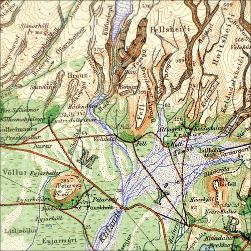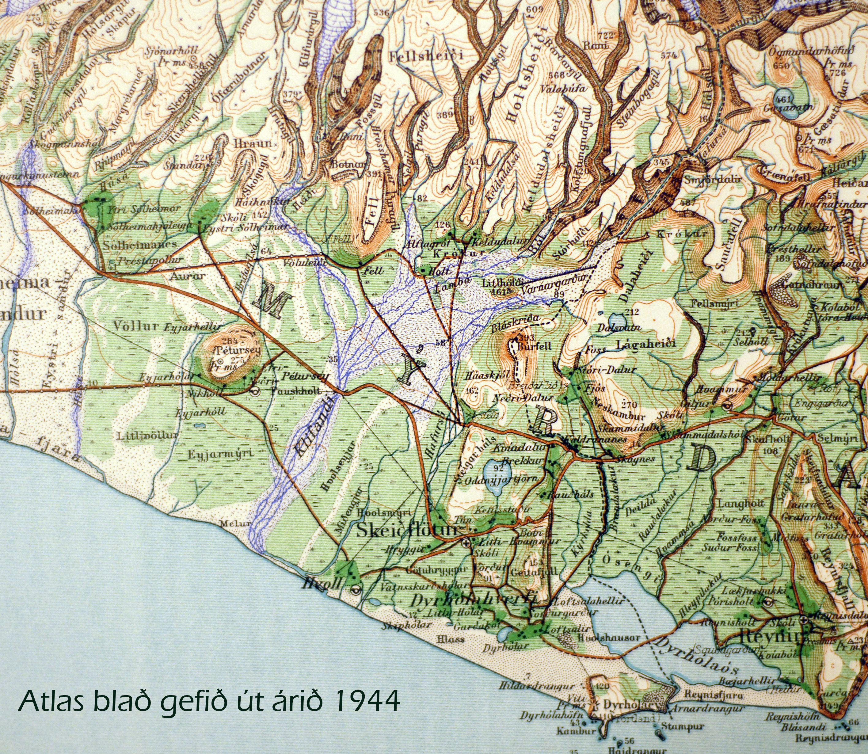 Á kortinu fyrir ofan (mynd 1) er núverandi vegur inn í Fellsmörk og yfir Klifandi ekki til staðar. Klifandi fær að renna óáreittur niður sandana þangað til ánni þar til hún sameinast Hafursá og þær renna saman undir brúna þar sem hringvegurinn er núna. Benda má á að á þessu korti sést varnargarðurinn sem beinir Hafursánni norður og vestur fyrir Litla-Höfða, sem er að einhverju leyti orsök vandamálanna undir Hlíðarbrautinni. Reyndar er gamli farvegur Hafursárinnar til sjávar (mun austar en nú er) sýndur þrátt fyrir að hann hafi væntanlega að mestu leyti verið orðinn þurr þegar kortið var gefið út.